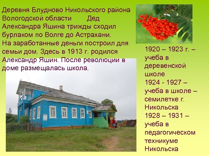 Деревня Блудново Никольского района Вологодской области Дед Александра Яшина трижды сходил бурлаком по Волге до Астрахани. На заработанные деньги построил для 1920 – 1923 г. – семьи дом. Здесь в 1913 г. родился учеба в Александр Яшин. После революции в деревенской доме размещалась школа. школе 1924 - 1927 – учеба в школе – семилетке г. Никольска 1928 – 1931 – учеба в педагогическом техникуме Никольска