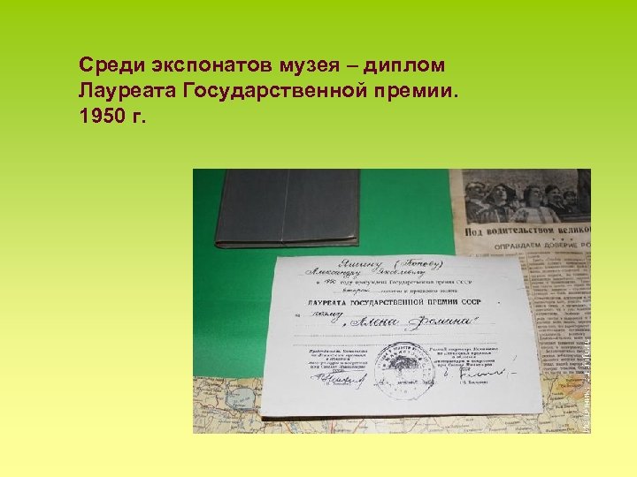 Среди экспонатов музея – диплом Лауреата Государственной премии. 1950 г.