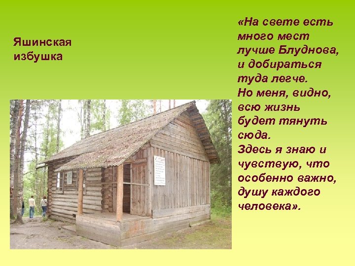 Яшинская избушка «На свете есть много мест лучше Блуднова, и добираться туда легче. Но меня, видно, всю жизнь будет тянуть сюда. Здесь я знаю и чувствую, что особенно важно, душу каждого человека» .