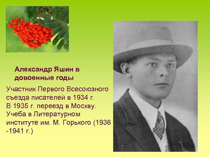 Александр Яшин в довоенные годы Участник Первого Всесоюзного съезда писателей в 1934 г. В 1935 г. переезд в Москву. Учеба в Литературном институте им. М. Горького (1936 -1941 г. )