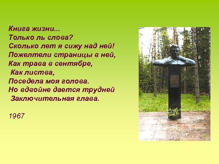 Книга жизни. . . Только ль слова? Сколько лет я сижу над ней! Пожелтели страницы в ней, Как трава в сентябре, Как листва, Поседела моя голова. Но вдвойне дается трудней Заключительная глава. 1967