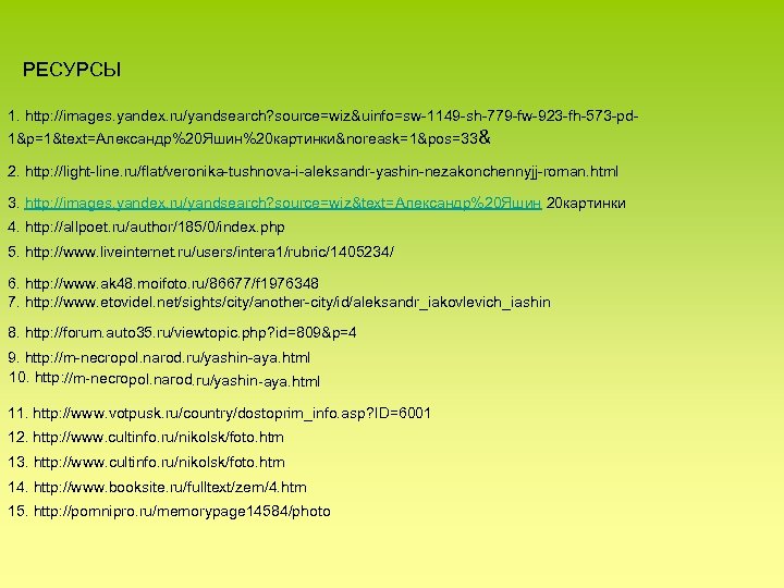 РЕСУРСЫ 1. http: //images. yandex. ru/yandsearch? source=wiz&uinfo=sw-1149 -sh-779 -fw-923 -fh-573 -pd 1&p=1&text=Александр%20 Яшин%20 картинки&noreask=1&pos=33& 2. http: //light-line. ru/flat/veronika-tushnova-i-aleksandr-yashin-nezakonchennyjj-roman. html 3. http: //images. yandex. ru/yandsearch? source=wiz&text=Александр%20 Яшин 20 картинки 4. http: //allpoet. ru/author/185/0/index. php 5. http: //www. liveinternet. ru/users/intera 1/rubric/1405234/ 6. http: //www. ak 48. moifoto. ru/86677/f 1976348 7. http: //www. etovidel. net/sights/city/another-city/id/aleksandr_iakovlevich_iashin 8. http: //forum. auto 35. ru/viewtopic. php? id=809&p=4 9. http: //m-necropol. narod. ru/yashin-aya. html 10. http: //m-necropol. narod. ru/yashin-aya. html 11. http: //www. votpusk. ru/country/dostoprim_info. asp? ID=6001 12. http: //www. cultinfo. ru/nikolsk/foto. htm 13. http: //www. cultinfo. ru/nikolsk/foto. htm 14. http: //www. booksite. ru/fulltext/zem/4. htm 15. http: //pomnipro. ru/memorypage 14584/photo