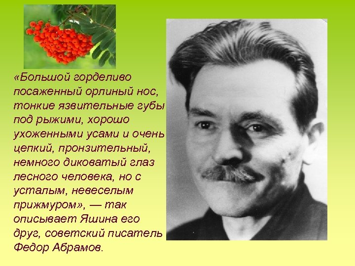 «Большой горделиво посаженный орлиный нос, тонкие язвительные губы под рыжими, хорошо ухоженными усами и очень цепкий, пронзительный, немного диковатый глаз лесного человека, но с усталым, невеселым прижмуром» , — так описывает Яшина его друг, советский писатель Федор Абрамов.