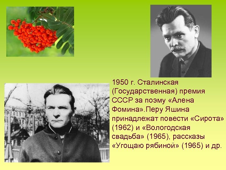 1950 г. Сталинская (Государственная) премия СССР за поэму «Алена Фомина» . Перу Яшина принадлежат повести «Сирота» (1962) и «Вологодская свадьба» (1965), рассказы «Угощаю рябиной» (1965) и др.