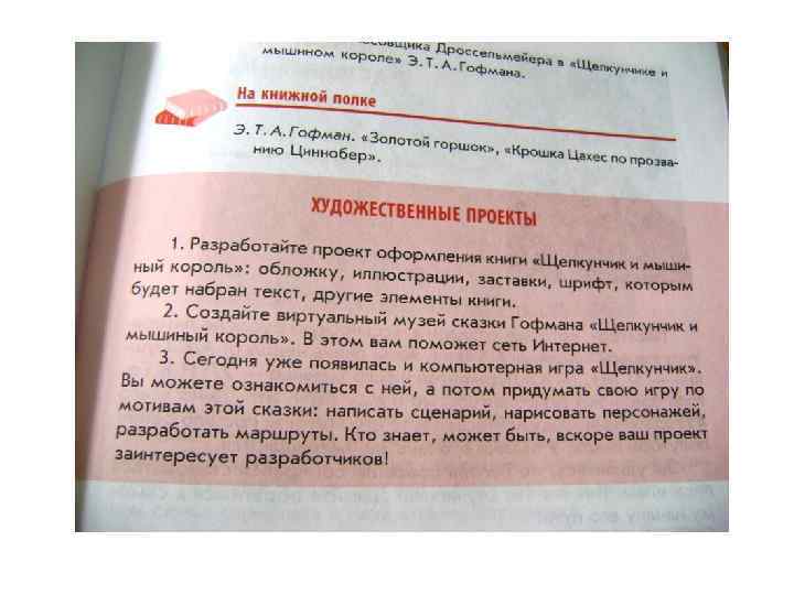 6 класс Е. Л. Шварц. «Обыкновенное чудо» (4 часа) Проектная деятельность Драматизация и инсценирование произведений Е. Л. Шварца ( «Сказка о потерянном времени» , «Красная шапочка» , «Два клена» , «Снежная королева» ) Литературно- художественная и аналитическая деятельность Сравнение пьесы- сказки Е. Л. Шварца с фольклорной сказкой. Оформление книги «Обыкновенное чудо» . Графическое и вербальное рисование декораций и портретов персонажей сказки. Устные портреты- диптихи «Принцесса в первом и последнем действии» , «Медведь в первом и последнем действии» . Воссоздание историй персонажей. Описание или рисование портретной галереи «Король и его свита» . Подбор музыкальных лейтмотивов к образам персонажей и музыкального сопровождения к эпизодам пьесы. Мизансценирование. Создание эскизов декораций. Отзыв о кинофильме М. Захарова «Обыкновенное чудо» . Сравнение образов главных героев в пьесе и кинофильме