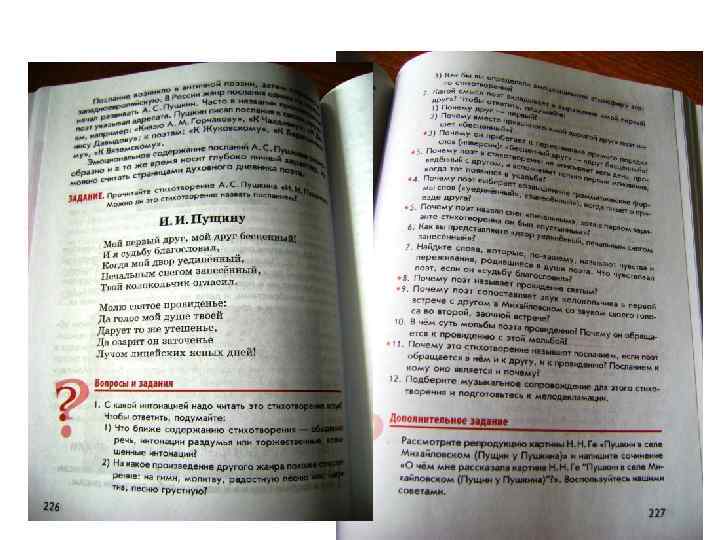 6 класс Р а з д е л 6. Дружба в жизни человека 1. А. С. Пушкин. «И. И. Пущину» ( «Мой первый друг, мой друг бесценный!. . » ) Представления А. С. Пушкина о дружбе. Посещение И. Пущиным поэта в Михайловском. Дружба как сила, преодолевающая любые преграды. Образ надежды в стихотворении. Теоретико- литературные знания. Дружеское послание как жанр лирики. Тропы. Ритм. Строфа. Культурное пространство. А. С. Пушкин и декабристы. Лицейские друзья Пушкина. Картина Н. Н. Ге «Пушкин в селе Михайловском» . Внеклассное чтение. М. Басина. «В садах Лицея» , «На берегах Невы» , «Далече от берегов Невы» ; С. Гейченко. «У Лукоморья» ; А. Гессен. «Все волновало нежный ум. . . » , «Жизнь поэта» ; «Друзья Пушкина: переписка, воспоминания, дневники» . Литературно- художественная и аналитическая деятельность Выразительное чтение. Подбор музыкального сопровождения к стихотворению. Подготовка сообщения о лицейских друзьях Пушкина. Сочинение по картине Н. Ге «Пушкин в селе Михайловском» . Сочинение- рассуждение «Что такое дружба? »