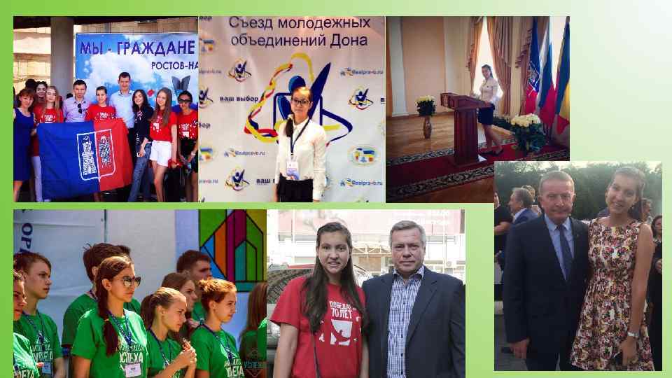 Резюме за 2014 -2016 года: Основные достижения Участница образовательной программы регионального проекта «Молодежная Команда Губернатора» . Апрель 2016 Благодарственное письмо от Ю. Е. Полякова за активную общественную работу, особый вклад в развитие молодежной политики и плодотворное сотрудничество с органами местного самоуправления. Апрель 2016 Участница молодежного форума «Молодая Волна. Путь к успеху!» Май 2016 Участница летней школы лидерства «Академия Успеха» . Июль 2016 Участница окружного форума школьного ученического самоуправления Южного Федерального округа. Сентябрь 2016 Награждена памятной медалью « 185 лет Байкову Андрею Матвеевичу» за значительный вклад в развитие патриотического движения в донской столице и популяризацию патриотического воспитания. Октябрь 2016. Участница патриотического форума школьников «БУДУЩЕЕ РОСТОВА» Ноябрь 2016.