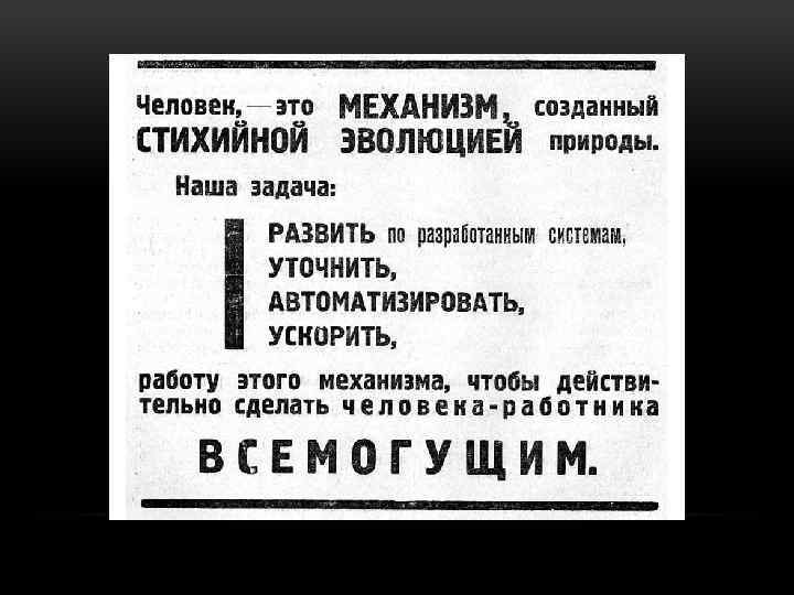 СЕМЬ ПРАВИЛ А. К. ГАСТЕВА ДЛЯ ВСЯКОГО ТРУДА • Правило № 1. Что такое научная организация труда? Это организация, основанная на строго учтенном опыте. • Правило № 2. Если хочешь вводить научную организацию труда, стань мастером хоть одной операции, рассчитай ее и дай ускорение. Тогда ты будешь говорить фактами, а не зубрежкой. • Правило № 3. Прежде чем изменить способы работы, надо их тщательно изучить. • Правило № 4. Не старайся сразу сделать переворот, начинай с пустяков. • Правило № 5. Не надоедай со своим изобретением, не хлопочи, а во что бы то ни стало претвори его в вещь. • Правило № 6. Никогда не говори о безвыходности. Не склоняйся перед происшествиями. Настойчивая мысль и упорная воля сумеют их победить. • Правило № 7. Знающий, но не умеющий - это механизм без двигателя.