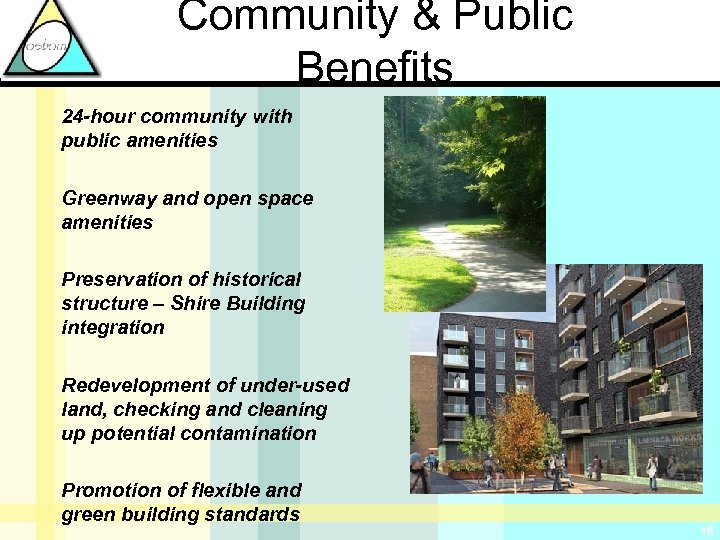 Community & Public Benefits 24 -hour community with public amenities Greenway and open space amenities Preservation of historical structure – Shire Building integration Redevelopment of under-used land, checking and cleaning up potential contamination Promotion of flexible and green building standards 16