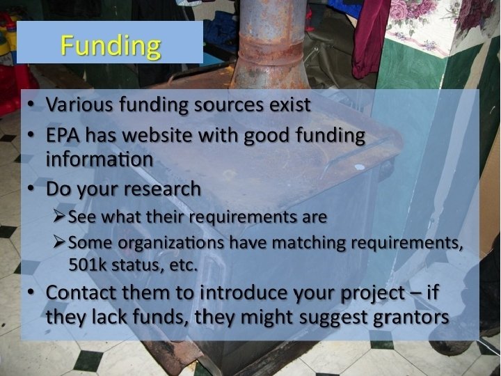 Why Conduct a Woodstove Changeout? • To help improve with both indoor and outdoor air quality • With current cost of fuel, installing a more efficient woodstove could drastically reduce your heating costs for fuel • Old, polluting stoves not as air tight as newer models, can allow smoke into home. Also emit more creosote (soot) due to inefficient combustion, which can build up in chimney