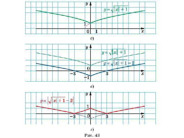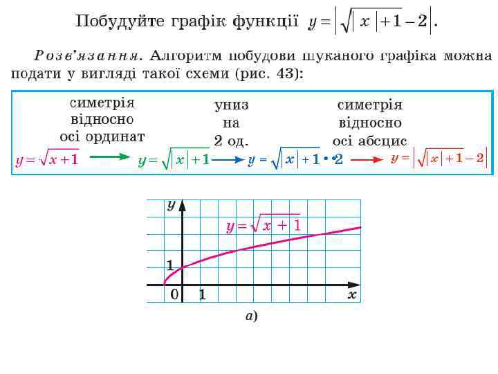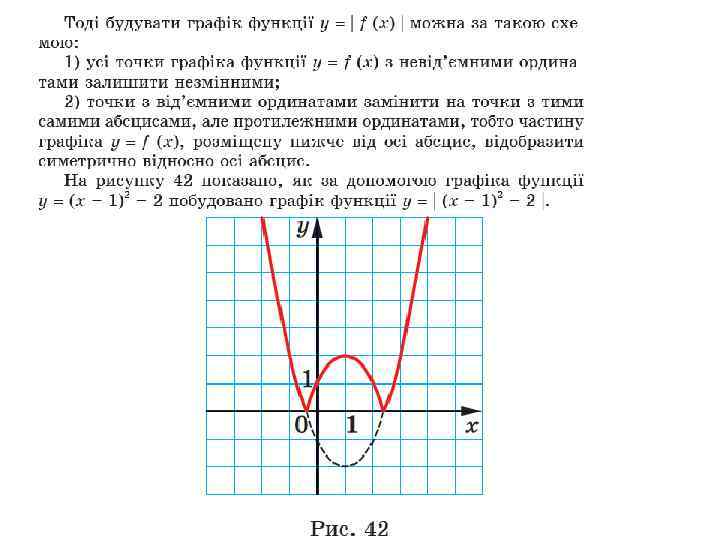 Як побудувати графіки функцій y = f (|x|) і y =|f(x)|, якщо відомо графік функції y = f (x) ? Тоді побудову графіка функції y = f (|x|) можна проводити за такою схемою: 1) побудувати ту частину графіка функції y = f (x), усі точки якої мають невід’ємні абсциси; 2) побудувати ту частину графіка функції y = f (–x), усі точки якої мають від’ємні абсциси. Об’єднання цих двох частин і складатиме графік функції y = f (|x|). Фактично це означає, що слід побудувати графік функції y = f (x) для x ≥ 0, а потім відобразити його симетрично відносно осі ординат.