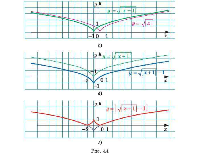 Узагальнююче повторення У 9 класі ми навчилися за допомогою графіка функції y = f (x) будувати графіки функцій y = f (x) + b, y = f (x + a), y = kf (x). Нагадаємо правила, які дозволяють виконати такі побудови. Графік функції y = f (x) + b можна отримати в результаті паралельного перенесення графіка функції y = f (x) на b одиниць угору, якщо b > 0, і на –b одиниць униз, якщо b < 0. На рисунках 23, 24 показано, як працює це правило для побудови графіків функцій y = x 2 – 4 і