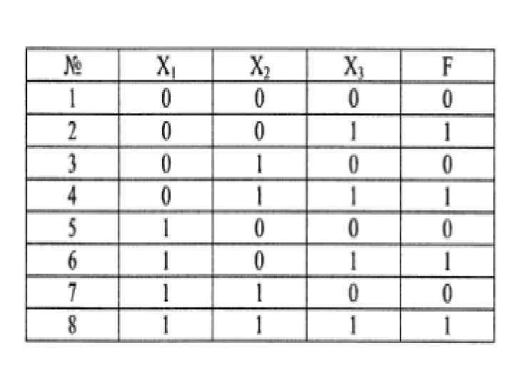 Табличное и алгебраическое задание булевских функций Задать булевскую функцию можно, определяя ее значения для всех наборов значений аргументов. Каждый аргумент может иметь два значения: 0 и 1, следовательно, n аргументов могут принимать 2 n различных наборов. Пусть, например, булевская функция имеет три аргумента: X 1, Х 2, Х 3. Общее число наборов 23 = 8; зададим таблицу истинности функции, указав для каждого набора значение функции.