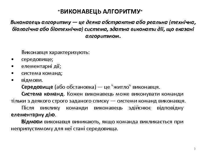 "ВИКОНАВЕЦЬ АЛГОРИТМУ" Виконавець алгоритму — це деяка абстрактна або реальна (технічна, біологічна або біотехнічна) система, здатна виконати дії, що вказані алгоритмом. Виконавця характеризують: • середовище; • елементарні дії; • система команд; • відмови. Середовище (або обстановка) — це "житло" виконавця. Система команд. Кожен виконавець може виконувати команди тільки з деякого строго заданого списку — системи команд виконавця. Після виклику команди виконавець здійснює відповідну елементарну дію. Відмови виконавця виникають, якщо команда викликається при неприпустимому для неї стані середовища. 3