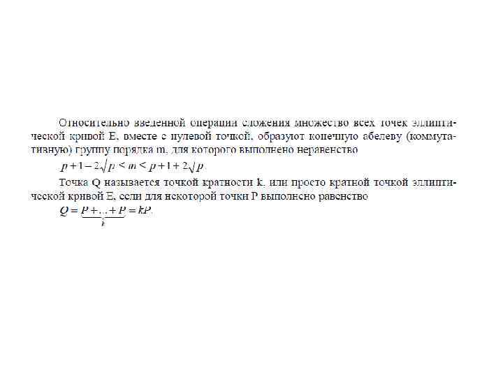 Эллиптическая кривая в конечном поле Fp Эллиптической кривой Е, определенной над конечным простым полем Fp называется множество пар чисел (x, y), x Є Fp, y Є Fp, удовлетворяющих тождеству: