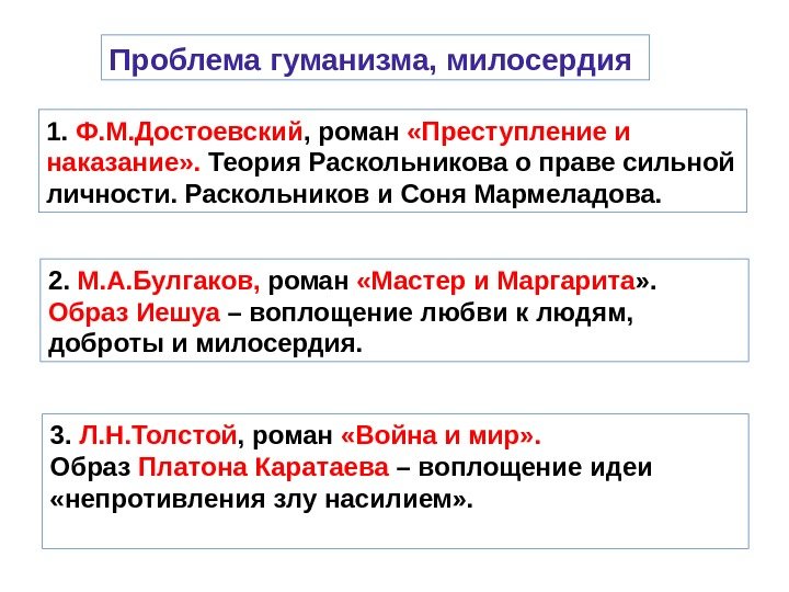 Проблема гуманизма, милосердия 1. Ф. М. Достоевский , роман «Преступление и наказание» . Теория Раскольникова о праве сильной личности. Раскольников и Соня Мармеладова. 2. М. А. Булгаков, роман «Мастер и Маргарита » . Образ Иешуа – воплощение любви к людям, доброты и милосердия. 3. Л. Н. Толстой , роман «Война и мир» . Образ Платона Каратаева – воплощение идеи «непротивления злу насилием» .