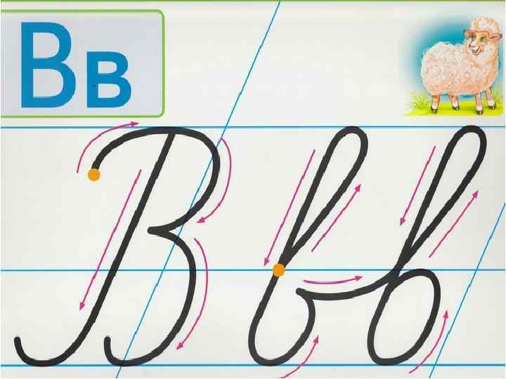 Алгоритм написання рядкової букви в ( «ве» ) 1. Починаємо писати трохи нижче верхньої рядкової лінії 2. Ведемо з нахилом угору 3. Заокруглюємо під верхньою міжрядковою лінією ліворуч і ведемо довгу пряму вниз до себе 4. Біля нижньої рядкової лінії заокруглюємо праворуч 5. Торкаємось нижньої рядкової, ведемо, заокруглюючи, угору до верхньої лінії робочого рядка, де торкнувшись її, заокруглюємо ліворуч 6. Закінчуємо писати біля першого елемента Алгоритм написання великої букви В ( «ве» ) 1. Починаємо писати букву від верхньої міжрядкової лінії 2. Ведемо вниз довгу пряму на себе до нижньої рядкової лінії і, торкнувшись її, заокруглюємо вліво 3. Другий елемент починаємо писати зліва від першого елемента нижче верхньої міжрядкової лінії 4. Закінчуємо писати близько середини робочого рядка 5. Ведемо вгору і заокруглюємо під верхньою міжрядковою лінією праворуч на півовал, що закінчується вище верхньої рядкової невеличким заокругленням ліворуч 6. Не відриваючи руки, рухом праворуч і вниз до себе пишемо більший нижній правий півовал, що закінчується заокругленням уліво близько першого елемента, вище нижньої лінії робочого рядка