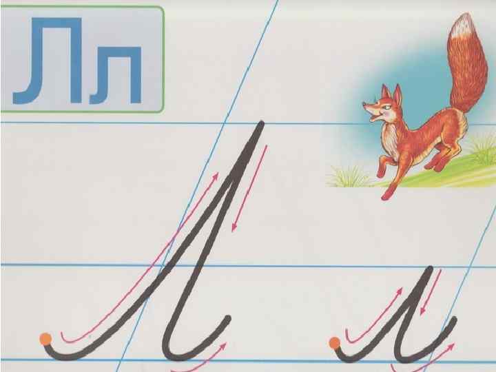 Алгоритм написання рядкової букви л ( «ел» ) 1. Починаємо писати трохи вище нижньої рядкової лінії 2. Заокруглюємо вниз праворуч 3. Торкаючись нижньої рядкової, ведемо вгору пряму коротку похилу лінію до верхньої лінії робочого рядочка 4. Не відриваючи руки, ведемо вниз на себе по писаному майже до серединиробочого рядка 5. Продовжуємо вести вниз на себе до нижньої лінії робочого рядка 6. Заокруглюємо праворуч, торкаючись нижньої рядкової лінії 7. Закінчуємо писати близько середини робочого рядка Алгоритм написання великої букви Л ( «ел» ) 1. Починаємо писати трохи вище нижньої рядкової лінії 2. Ведемо вниз до нижньої лінії робочого рядка 3. Торкнувшись нижньої рядкової, заокруглюємо вправо 4. Ведемо довгу пряму похилу вгору до верхньої міжрядкової лінії 5. Не відриваючи руки, ведемо довгу пряму лінію вниз на себе до нижньої лінії робочого рядка 6. Заокруглюємо вправо 7. Закінчуємо писати близько середини робочого рядк