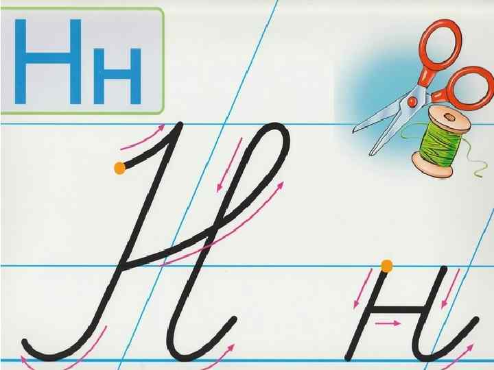 Алгоритм написання рядкової букви н ( «ен» ) 1. Ведемо коротку пряму лінію вниз на себе від верхньої до нижної рядкової лінії 2. Від середини першого елемента праворуч ведемо коротку горизонтальну пряму лінію на відстань, яка дорівнює половині висоти робочого рядка 3. Від верхньої рядкової лінії ведемо вниз на себе, пряму коротку лінію, яку з’єднуємо з кінцем другого елемента, і продовжуємо до нижньої лінії робочого рядка 4. Торкнувшись нижньої лінії, заокруглюємо праворуч 5. Закінчуємо писати близько середини робочого рядка Алгоритм написання великої букви Н ( «ен» ) 1. Починаємо писати вище середини відстані між верхньою рядковою та верхньою міжрядковою лініями 2. Ведемо коротку пряму похилу лінію праворуч угору до верхньої міжрядкової 3. Торкнувшись верхньої міжрядкової лінії, не відриваючи руки, ведемо вниз на себе довгу пряму лінію до нижньої рядкової 4. Заокруглюємо вліво 5. Закінчуємо писати близько середини робочого рядка 6. Третій елемент починаємо писати на місці перетину другого елемента з верхньою рядковою лінією 7. Ведемо пряму похилу лінію вгору 8. Заокруглюємо ліворуч на відстані, яка дорівнює половині висоти від верхньої міжрядкової до нижньої рядкової 9. Торкаючись верхньої міжрядкової лінії, ведемо вниз на себе довгу пряму лінію до нижньої рядкової лінії 10. Торкнувшись нижньої робочої лінії, заокруглюємо праворуч 11. Закінчуємо писати близько середини робочого рядка