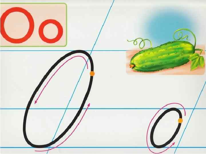 Алгоритм написання рядкової букви о 1. Починаємо писати трохи нижче верхньої рядкової лінії 2. Ведемо вгору до верхньої лінії робочого рядка 3. Торкаючись верхньої робочої лінії, заокруглюємо ліворуч 4. Ведемо вниз на себе, теж заокруглюючи 5. Біля нижньої рядкової лінії заокруглюємо праворуч 6. Ведемо вгору до початку овалу Алгоритм написання великої букви О 1. Починаємо писати трохи нижче верхньої міжрядкової лінії 2. Ведемо, заокруглюючи, ліворуч угору 3. Торкаючись верхньої міжрядкової лінії, заокруглюємо ліворуч 4. Ведемо вниз на себе, теж заокруглюючи 5. Торкаючись нижньої рядкової лінії, заокруглюємо праворуч 6. Ведемо вгору до початку овалу