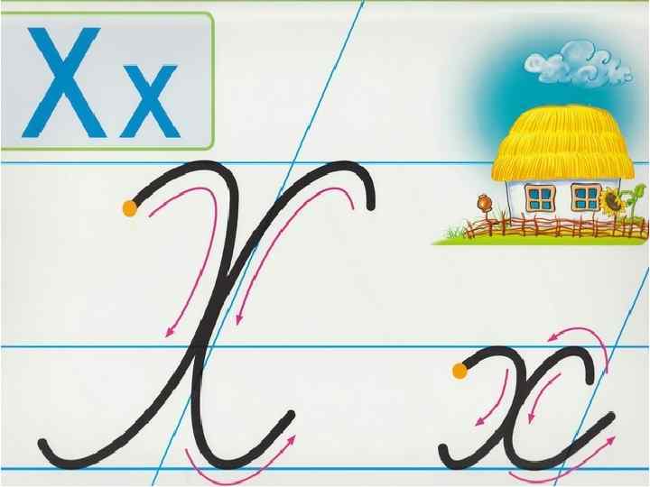 Алгоритм написання рядкової букви х ( «ха» ) 1. Починаємо писати нижче верхньої рядкової лінії 2. Ведемо, заокруглюючи праворуч, угору до верхньої рядкової лінії 3. Торкнувшись верхньої рядкової лінії, ведемо вниз на себе, теж заокруглюючи 4. Біля нижньої рядкової лінії заокруглюємо ліворуч 5. Торкаючись нижньої лінії робочого рядка, ведемо вгору 6. Закінчуємо писати близько середини робочого рядка 7. Відступивши від першого елемента відстань, що дорівнює ширині першого півовала, і нижче верхньої міжрядкової лінії пишемо лівий півовал 8. Ведемо, заокруглюючи ліворуч угору 9. Торкаючись верхньої рядкової лінії, заокруглюємо вліво вниз на себе 10. Торкнувшись першого елемента трохи нижче верхньої рядкової, ведемо по писаному до середини робочого рядка 11. Торкнувшись нижньої рядкової лінії, заокруглюємо праворуч угору 12. Закінчуємо писати близько середини робочого рядка Алгоритм написання великої букви X ( «ха» ) 1. Починаємо писати нижче верхньої міжрядкової лінії 2. Ведемо, заокруглюючи праворуч, угору до верхньої міжрядкової лінії 3. Торкнувшись верхньої міжрядкової лінії, ведемо вниз на себе, теж заокруглюючи 4. Біля нижньої рядкової лінії заокруглюємо ліворуч 5. Торкаючись нижньої лінії робочого рядка, ведемо вгору 6. Закінчуємо писати близько середини робочого рядка 7. Відступивши від першого елемента відстань, що дорівнює ширині першого півовала, і нижче верхньої міжрядкової лінії пишемо лівий півовал 8. Ведемо, заокруглюючи ліворуч угору 9. Торкаючись верхньої міжрядкової лінії, заокруглюємо вліво вниз на себе 10. Торкнувшись першого елемента трохи нижче верхньої міжрядкової, ведемо по писаному до середини робочого рядка 11. Торкнувшись нижньої рядкової лінії, заокруглюємо праворуч угору