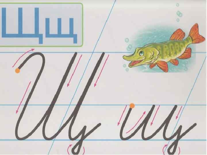 Алгоритм написання рядкової букви щ ( «ща» ) 1. Починаємо писати від верхньої рядкової лінії коротку пряму лінію вниз на себе 2. Біля нижньої рядкової лінії заокруглюємо праворуч 3. Торкнувшись нижньої рядкової лінії ведемо вгору до верхньої рядкової лінії 4. Не відриваючи руки, ведемо по писаному коротку лінію вниз на себе 5. Заокруглюємо, торкнувшись нижньої рядкової лінії праворуч 6. Ведемо вгору до верхньої робочої лінії 7. Не відриваючи руки, ведемо по писаному коротку пряму лінію вниз на себе 8. Біля нижньої рядкової лінії заокруглюємо праворуч угору, торкнувшись цієї лінії 9. Закінчуємо писати від другої короткої прямої лінії на відстані, що дорівнює половині робочого рядка і трохи вище нижньої рядкової лінії 10. Не відриваючи руки, ведемо вниз коротку пряму лінію до себе на відстань, що дорівнює половині висоти робочого рядка. Заокруглюємо ліворуч угору до перетину з нижньою рядковою і короткою прямою лініями 11. Закінчуємо писати трохи вище нижньої рядкової лінії Алгоритм написання великої букви Щ ( «ща» ) 1. Починаємо писати нижче верхньої міжрядкової лінії 2. Ведемо, заокруглюючи, угору до верхньої міжрядкової лінії 3. На відстані, що дорівнює половині робочого рядка, заокруглюємо праворуч 4. Ведемо довгу пряму лінію вниз на себе до нижньої рядкової лінії. Заокруглюємо праворуч 5. Продовжуємо до верхньої міжрядкової лінії 6. Не відриваючи руки, повертаємося по писаному від верхньої міжрядкової до верхньої рядкової лінії 7. Ведемо далі до нижньої рядкової лінії 8. Торкаючись нижньої рядкової лінії, заокруглюємо праворуч 9. Ведемо вгору до верхньої міжрядкової лінії 10. Не відриваючи руки, ведемо по писаному довгу пряму лінію вниз на себе 11. Продовжуємо пряму далі до нижньої рядкової 12. Торкаючись нижньої лінії робочого рядка, заокруглюємо праворуч угору 13. Закінчуємо писати від другої довгої прямої лінії на відстані, що дорівнює половині робочого рядка і на його середи 14. Не відриваючи руки, ведемо вниз коротку пряму похилу лінію до себе на відстань, що дорівнює половині висоти робочого рядка 15. Заокруглюємо ліворуч вгору до перетину з нижньою рядковою і короткою прямою лініями 16. Закінчуємо писати трохи вище нижньої рядкової