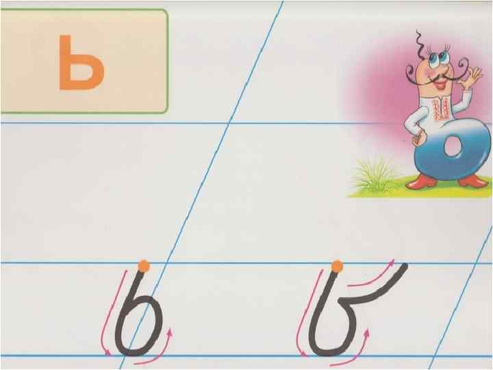 Алгоритм написання рядкової букви б ( «бе» ) 1. Починаємо писати букву нижче верхньої рядкової лінії 2. Ведемо вгору до верхньої лінії робочого рядка 3. Заокруглюємо ліворуч 4. Ведемо вниз на себе, теж заокруглюючи 5. Біля нижньої рядкової лінії заокруглюємо праворуч 6. Ведемо вгору, заокруглюючи, до початку півовала і далі до верхньої рядкової лінії 7. Не відриваючи руки продовжуємо писати похилу пінії до верхньої міжрядкової лінії 8. Не відриваючи руки, ведемо коротку горизонтальну лінію, на ширину великої букви. Алгоритм написання великої букви Б ( «бе» ) 1. Починаємо писати літеру Б ( «бе» ) від верхньої міжрядкової лінії 2. Ведемо довгу пряму лінію вниз на себе до нижньої рядкової лінії, торкнувшись її, заокруглюємо вліво 3. Закінчуємо перший елемент близько середини робочого рядка 4. Другий елемент починаємо писати нижче верхньої міжрядкової лінії ліворуч від початку першого елемента 5. Заокруглюємо праворуч до верхньої міжрядкової лінії і ведемо далі по ній