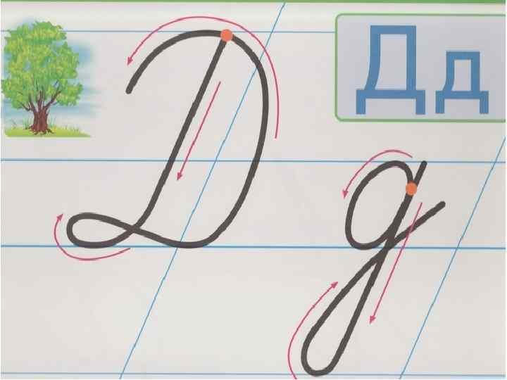 Алгоритм написання рядкової букви д ( «де» ) 1. Починаємо писати букву нижче верхньої рядкової лінії 2. Ведемо вгору до верхньої лінії робочого рядка 3. Заокруглюємо ліворуч 4. Ведемо вниз на себе, теж заокруглюючи 5. Біля нижньої рядкової лінії заокруглюємо праворуч 6. Ведемо вгору, заокруглюючи, до початку півовала і далі до верхньої рядкової лінії 7. Повертаючись по написаному, ведемо довгу пряму лінію вниз на себе 8. Біля нижньої міжрядкової лінії заокруглюємо ліворуч 9. Ведемо вгору до перетину з нижньою рядковою і довгою прямою лініями 10. Закінчуємо писати близько середини робочого рядка Алгоритм написання великої букви Д ( «де» ) 1. Починаємо писати від верхньої міжрядкової лінії довгу пряму лінію вниз на себе 2. Біля нижньої рядкової лінії заокруглюємо ліворуч і трішки вгору 3. Заокруглюємо праворуч униз, перетинаючи довгу лінію 4. Торкаючись нижньої рядкової лінії на відстані, яка дорівнює ширині робочого рядка, заокруглюємо вгору 5. Ведемо до верхньої міжрядкової лінії 6. Не доходячи до верхньої міжрядкової лінії, повертаємо вліво, торкаючись початку першого елемента 7. Закінчуємо писати нижче верхньої міжрядкової лінії зліва від прямої на відстані, що менша за ширину робочого рядка