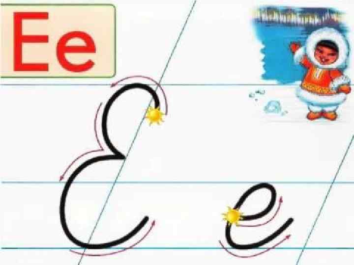 Алгоритм написання рядкової букви е 1. Починаємо писати трохи нижче середини робочого рядка 2. Ведемо праворуч угору 3. Заокруглюємо вліво, торкаючись верхньої рядкової лінії 4. Ведемо, заокруглюючи вниз на себе, до нижньої рядкової лінії 5. Заокруглюємо праворуч 6. Закінчуємо писати близько нижньої робочої рядка Алгоритм написання великої букви Е 1. Починаємо писати трохи нижче верхньої міжрядкової лінії 2. Заокруглюємо вліво, торкаючись верхньої міжрядкової лінії 3. Ведемо вниз насебе і, недоводячи до верхньої рядкової лінії, заокруглюємо вправо, не заокруглюємо вгору 4. Безвідривним рухом ведемо вниз на себе, заокруглюючи вліво 5. Не доводячи до нижньої рядкової лінії, заокруглюємо вправо 6. Торкаючись нижньої рядкової лінії, закінчуємо писати близько середини робочого рядка