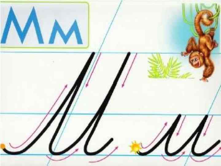 Алгоритм написання рядкової букви м ( «ем» ) 1. Починаємо писати трохи вище нижньої рядкової лінії 2. Заокруглюємо вниз праворуч 3. Торкаючись нижньої рядкової, ведемо вгору пряму коротку похилу лінію до верхньої лінії робочого рядка 4. Не відриваючи руки, ведемо вниз на себе по писаному майже до середини робочого рядка 5. Продовжуємо вести вниз на себе до нижньої лінії робочого рядка 6. Заокруглюємо праворуч 7. Торкаючись нижньої рядкової лінії, ведемо вгору коротку пряму до верхньої лінії робочого рядка 8. Не відриваючи руки, ведемо по писаному вниз на себе до середини робочого рядка 9. Продовжуємо вести вниз на себе до нижньої лінії робочого рядка 10. Заокруглюємо праворуч біля нижньої рядкової лінії 11. Закінчуємо писати близько середини робочого рядка Алгоритм написання великої букви М ( «ем» ) 1. Починаємо писати трохи вище нижньої рядкової лінії 2. Ведемо вниз до нижньої лінії робочого рядка 3. Торкнувшись нижньої рядкової, заокруглюємо вправо 4. Ведемо довгу пряму похилу вгору до верхньої міжрядкової лінії 5. Не відриваючи руки, ведемо пряму лінію вниз на себе до нижньої лінії робочого рядка 6. Заокруглюємо вправо 7. Ведемо вгору довгу пряму до верхньої міжрядкової лінії 8. Не відриваючи руки, пишемо по писаному вниз на себе до верхньої лінії робочого рядка 9. Продовжуємо пряму до нижньої робочої лінії 10. Торкнувшись нижньої рядкової, заокруглюємо вправо 11. Закінчуємо писати близько середини робочого рядка