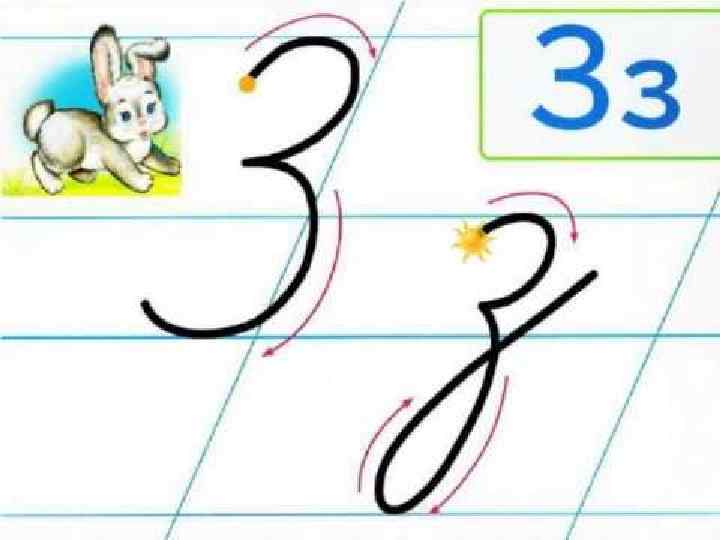 Алгоритм написання рядкової букви з ( «зе» ) 1. Починаємо писати нижче верхньої рядкової лінії 2. Ведемо вгору до верхньої рядкової лінії 3. Заокруглюємо вправо 4. Ведемо вниз на себе 5. Трохи не доводячи до нижньої рядкової, заокруглюємо вліво без заокруглень вгору 6. Не відриваючи руки, рухом праворуч і вниз описуємо нижній півовал 7. Торкнувшись нижньої міжрядкової лінії, пишемо петлю, що перетинає півовал на нижній рядковій лінії 8. Закінчуємо писати близько середини робочого рядка Алгоритм написання великої букви З ( «зе» ) 1. Починаємо писати нижче верхньої міжрядкової лінії 2. Заокруглюємо вправо 3. Заокруглюємо вліво 4. Торкаючись верхньої міжрядкової лінії, ведемо вниз на себе 5. Закінчуємо писати перший елемент над верхньою рядковою, не заокруглюючи вгору 6. Не відриваючи руки, заокруглюємо вправо вниз 7. Ведемо на себе до нижньої рядкової лінії 8. Заокруглюємо вліво 9. Торкаючись нижньої рядкової, закінчуємо писати близько середини робочого рядка