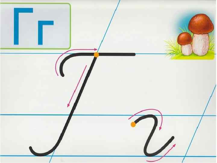 Алгоритм написання рядкової літери г ( «ге» ) 1. Починаємо писати літеру нижче верхньої лінії робочого рядка 2. Заокруглюємо праворуч, торкаючись верхньої рядової лінії 3. Ведемо вниз на себе пряму коротку лінію до нижньої рядкової лінії 4. Торкаючись нижнбої лінії робочого рядка, заокруглюємо вправо 5. Закінчуємо писати близько середини робочого рядка Алгоритм написання великої літери Г( «ге» ) 1. Починаємо писати літеру від верхньої міжрядкової лінії 2. Ведемо довгу пряму лінію вниз на себе до нижньої рядкової лінії 3. Біля нижньої рядкової лінії заокруглюємо ліворуч 4. Закінчуємо писати близько середини робочого рядка 5. Другий елемент починаємо писати нижче міжрядкової лінії зліва від початку першого елемента 6. Ведемо вгору, заокругливши вправо, до верхньої міжрядкової лінії 7. Ведемо далі по верхній лінії на відстані, щодорівнює ширині робочого рядка