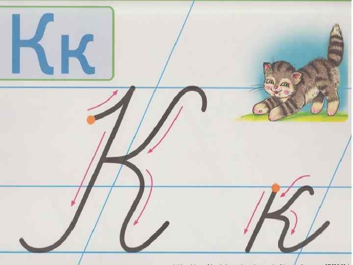 Алгоритм написання рядкової букви к ( «ка» ) 1. Від верхньої рядкової лінії, ведемо коротку пряму вниз на себе до нижньої рядкової лінії 2. Другий елемент починаємо писати на відстані, що дорівнює половині робочого рядка трохи нижче верхньої рядкової лінії 3. Заокруглюємо, торкаючись верхньої рядкової лінії 4. Ведемо вниз до середини робочого рядка 5. Повертаємо вліво і ведемо до середини першого елемента 6. Не відриваючи руки, ведемо праворуч по писаному до того місця, де другий елемент піднімається вгору 7. Ведемо вниз до нижньої рядкової лінії 8. Торкаючись нижньої рядкової лінії, заокруглюємо вправо 9. Закінчуємо писати близько середини робочого рядка Алгоритм написання великої букви К ( «ка» ) 1. Починаємо писати вище середини відстані між верхньою рядковою та верхньою міжрядковою лініями 2. Ведемо коротку пряму похилу лінію праворуч угору до верхньої міжрядкової 3. Торкнувшись верхньої міжрядкової лінії, не відриваючи руки, ведемо вниз на себе довгу пряму лінію до нижньої рядкової 4. Заокруглюємо вліво 5. Закінчуємо писати близько середини робочого рядка 6. Третій елемент починаємо писати на відстані, що дорівнює половині робочого рядка трохи нижче верхньої міжрядкової лінії 3. Заокруглюємо, торкаючись верхньої міжрядкової лінії 4. Ведемо вниз до середини робочого рядка. Повертаємо вліво і ведемо до середини першого елемента 5. Не відриваючи руки, ведемо праворуч по писаному до того місця, де третій елемент піднімається вгору. Ведемо вниз до нижньої рядкової лінії 6. Торкаючись нижньої рядкової лінії, заокруглюємо вправо. Закінчуємо писати близько середини робочого рядка