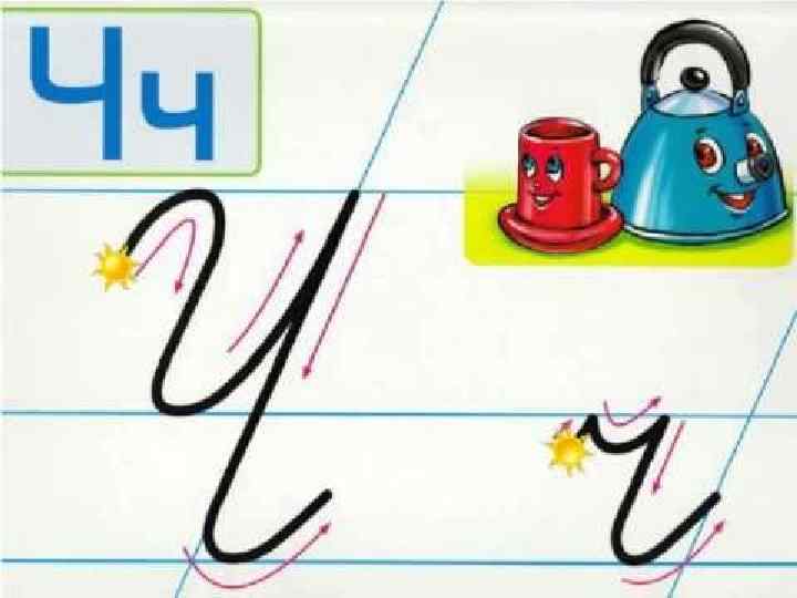 Алгоритм написання рядкової букви ч ( «че» ) 1. Починаємо писати трохи нижче верхньої рядкової лінії 2. Ведемо вгору коротку похилу риску до верхньої рядкової лінії 3. Не відриваючи руки, пишемо горизонтальну коротку вигнуту вниз лінію, яка закінчується на верхній рядковій лінії від кінця короткої риски на відстані, що дорівнює половині робочого рядка 4. Не відриваючи руки, ведемо коротку пряму вниз на себе 5. Біля нижньої рядкової заокруглюємо праворуч, торкаючись цієї лінії 6. Закінчуємо писати близько середини робочого рядка Алгоритм написання великої букви Ч ( «че» ) 1. Починаємо писати нижче верхньої міжрядкової лінії 2. Ведемо, заокруглюючи праворуч, угору до верхньої міжрядкової лінії 3. На відстані, що дорівнює половині робочого рядка, заокруглюємо праворуч 4. Ведемо пряму вниз на себе до верхньої рядкової лінії 5. Заокруглюємо праворуч, торкаючись цієї лінії, і продовжуємо до верхньої міжрядкової лінії 6. Не відриваючи руки, ведемо по писаному до верхньої лінії робочого рядка 7. Ведемо далі вниз на себе довгу пряму до нижньої рядкової лінії 8. Торкнувшись нижньої рядкової лінії, заокруглюємо праворуч 9. Закінчуємо писати близько середини робочого рядка
