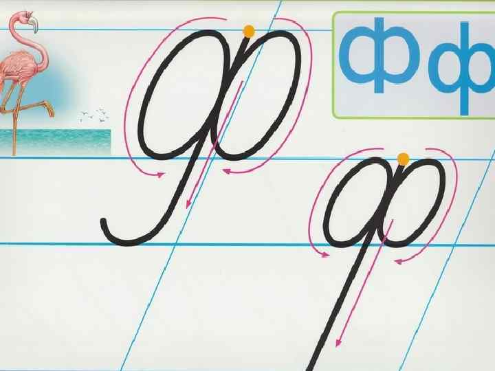 Алгоритм написання рядкової букви ф ( «еф» ) 1. Починаємо писати трохи нижче верхньої рядкової лінії 2. Ведемо вгору до верхньої лінії робочого рядка 3. Торкаючись верхньої рядкової лінії, заокруглюємо ліворуч 4. Ведемо вниз на себе, теж заокруглюючи 5. Біля нижньої робочої лінії, заокруглюємо праворуч 6. Торкнувшись нижньої рядкової лінії, ведемо вгору до початку овалу і далі до верхньої рядкової лінії 7. Повертаючись по писаному, ведемо вниз на себе довгу пряму лінію до нижньої міжрядкової лінії 8. Третій елемент пишемо у тому місці, де починали писати перший овал — трохи нижче верхньої рядкової лінії 9. Ведемо, заокруглюючи праворуч угору, до верхньої рядкової лінії 10. Торкнувшись верхньої рядкової лінії, ведемо вниз на себе 11. Біля нижньої рядкової лінії заокруглюємо ліворуч 12. Ведемо вгору до початку овалу Алгоритм написання великої букви Ф ( «еф» ) 1. Починаємо писати трохи нижче верхньої міжрядкової лінії 2. Ведемо, заокруглюючи ліворуч, угору 3. Торкаючись верхньої міжрядкової лінії, заокруглюємо ліворуч 4. Ведемо вниз на себе, теж заокруглюючи 5. Торкаючись верхньої робочої лінії, заокруглюємо праворуч 6. Ведемо вгору до початку овалу і далі до верхньої міжрядкової лінії 7. Повертаючись по писаному, ведемо вниз на себе довгу пряму лінію до нижньої рядкової 8. Торкнувшись нижньої робочої лінії, заокруглюємо ліворуч 9. Закінчуємо писати близько середини робочого рядка 10. Третій елемент пишемо у тому місці, де починали писати перший овал — трохи нижче верхньої міжрядкової лінії 11. Ведемо, заокруглюючи праворуч угору, до верхньої міжрядкової лінії 12. Торкнувшись верхньої міжрядкової лінії, ведемо вниз на себе, теж заокруглюючи 13. Біля верхньої лінії робочого рядка заокруглюємо ліворуч