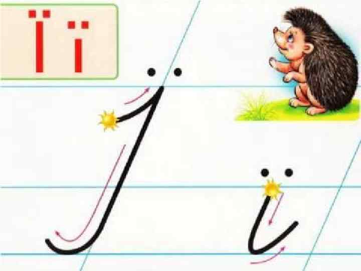 Алгоритм написання рядкової букви й ( «йот» ) 1. Починаємо писати від верхньої міжрядкової лінії пряму коротку лінію на себе 2. Біля нижньої рядкової лінії заокруглюємо праворуч 3. Торкаючись нижньої рядкової лінії, ведемо вгору до верхньої рядкової лінії 4. Не відриваючи руки, ведемо по писаному на себе коротку пряму вниз 5. Біля нижньої рядкової лінії заокруглюємо праворуч угору 6. Ведемо вгору до середини робочого рядка 7. Над верхньою рядковою лінією між двома вже написаними елементами пишемо коротку горизонтальну вигнуту лінію зліва, ведемо праворуч Алгоритм написання великої букви Й ( «йот» ) 1. Починаємо писати нижче верхньої міжрядкової лінії 2. Ведемо, заокруглюючи, угору до верхньої міжрядкової лінії 3. На відстані, що дорівнює половині робочого рядка, заокруглюємо праворуч 4. Ведемо довгу пряму лінію вниз на себе до нижньої рядкової лінії 5. Заокруглюємо праворуч 6. Продовжуємо до верхньої міжрядкової лінії 7. Не відриваючи руки, повертаємося по писаному від верхньої міжрядкової до верхньої рядкової лінії 8. Ведемо далі до нижньої рядкової лінії 9. Торкаючись нижньої рядкової лінії, заокруглюємо праворуч 10. Ведемо вгору до середини робочого рядка 11. Над верхньою міжрядковою лінією між двома вже написаними елементами пишемо коротку горизонтальну вигнуту лінію зліва, ведемо праворуч