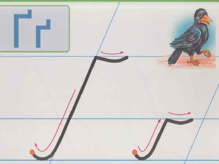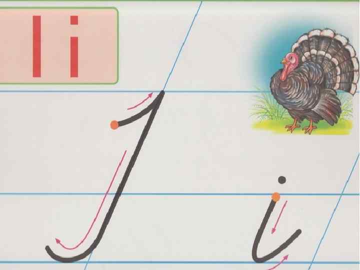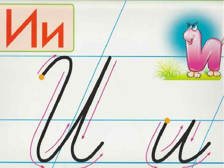 Алгоритм написання рядкової букви и 1. Починаємо писати від верхньої рядкової лінії пряму коротку лінію вниз на себе 2. Біля нижньої рядкової заокруглюємо праворуч 3. Торкнувшись нижньої лінії робочого рядочка, ведемо вгору до верхньої рядкової лінії 4. Не відриваючи руки, ведемо по писаному на себе коротку пряму вниз 5. Заокруглюємо біля нижньої рядкової праворуч вгору 6. Закінчуємо писати близько середини робочого рядка