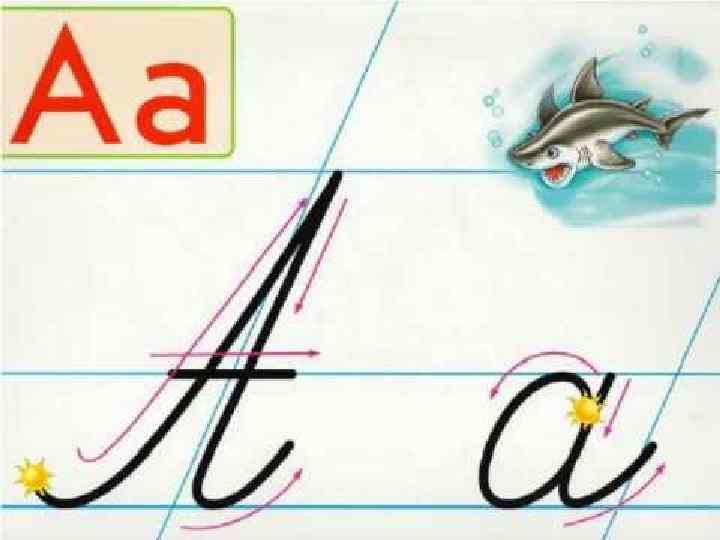 Алгоритм написання рядкової букви а 1. Починаємо писати букву трохи нижче верхньої рядкової лінії 2. Ведемо вгору до верхньої лінії робочого рядка 3. Заокруглюємо ліворуч 4. Ведемо вниз на себе, теж заокруглюючи 5. Біля нижньої рядкової лінії заокруглюємо праворуч 6. Ведемо, заокруглюючи, до початку півовалу і далі до верхньої лінії робочого рядка 7. Повертаючись по написаному, ведемо коротку пряму лінію вниз на себе, яку біля нижньої рядкової заокруглюємо праворуч 8. Закінчуємо писати близько середини рядка Алгоритм написання великої букви А 1. Починаємо писати трохи вище нижньої рядкової лінії 2. Ведемо вниз до нижньої лінії робочого рядка 3. Торкнувшись нижньої рядкової, заокруглюємо вправо 4. Ведемо довгу пряму похилу вгору до верхньої міжрядкової лінії 5. Не відриваючи руки, ведемо пряму лінію вниз на себе до нижньої лінії робочого рядка 6. Заокруглюємо вправо 7. Закінчуємо писати близько середини робочого рядка 8. Натупний елемент починаємо писати на верхній рядковій лінії 9. Ведемо горизонтальну лінію