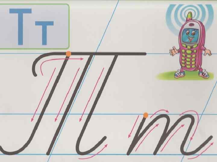 Алгоритм написання рядкової букви т ( «те» ) 1. Ведемо від верхньої до нижньої рядкової лінії вниз на себе коротку пряму лінію 2. Повертаємося по писаному майже до верхньої робочої лінії 3. Заокруглюємо праворуч, торкаючись верхньої лінії робочого рядка 4. Ведемо вниз на себе коротку пряму до нижньої рядкової лінії 5. Повертаємося по писаному майже до верхньої робочої лінії 6. Заокруглюємо праворуч, торкаючись верхньої лінії робочого рядка 7. Ведемо вниз на себе коротку пряму лінію до нижньої рядкової лінії 8. Торкаючись нижньої лінії робочого рядка, заокруглюємо праворуч 9. Закінчуємо писати близько середини робочого рядка Алгоритм написання великої букви Т( «те» ) 1. Ведемо від верхньої міжрядкової лінії пряму довгу лінію вниз на себе до нижньої рядкової лінії 2. Торкаючись нижньої робочої лінії, заокруглюємо ліворуч 3. Закінчуємо близько середини робочого рядка 4. Від початку першого елемента залишаємо відстань, що дорівнює половині висоти від верхньої міжрядкової до верхньої рядкової лінії 5. Ведемо довгу пряму лінію вниз на себе до нижньої лінії робочого рядка 6. Від початку другого елемента відступаємо відстань, що дорівнює половині висоти від верхньої міжрядкової до верхньої рядкової лінії 7. Ведемо довгу пряму лінію вниз на себе до нижньої лінії робочого рядка 8. Торкнувшись нижньої рядкової лінії, заокруглюємо праворуч 9. Відступаємо від початку першого елемента вліво відстань, що дорівнює половині висоти від верхньої міжрядкової до верхньої рядкової лінії, трішки нижче верхньої міжрядкової лінії 10. Ведемо, заокруглюючи, праворуч угору до верхньої міжрядкової лінії 11. Ведемо далі по верхній міжрядковій лінії, торкаючись початку першого, другого і третього елементів 12. Закінчуємо писати від початку третього елемента на відстані, що дорівнює ширині робочого рядка