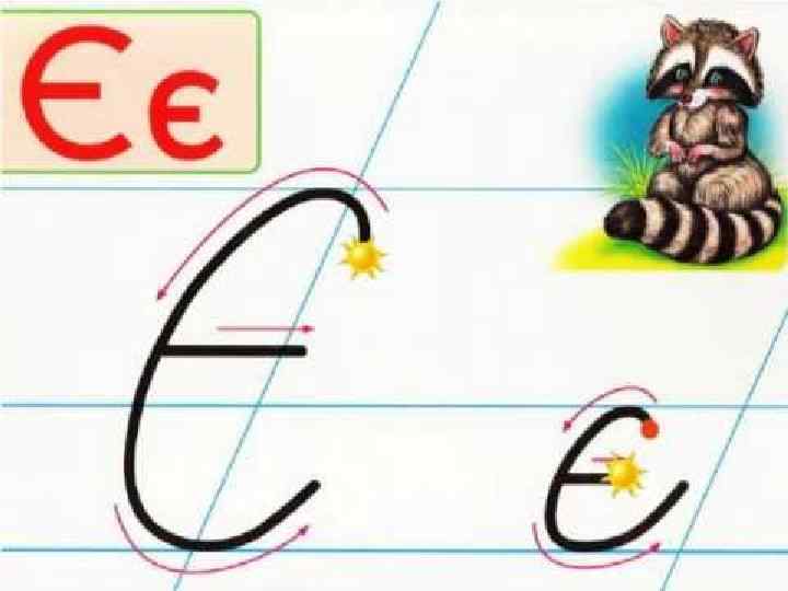 Алгоритм написання рядкової букви є 1. Починаємо писати трохи нижче верхньої рядкової лінії 2. Заокруглюємо ліворуч, торкаючись верхньої лінії робочого рядка 3. Ведемо, заокруглюючи, униз на себе 4. Біля нижньої рядкової лінії заокруглюємо праворуч 5. Закінчуємо писати близько середини робочого рядка 6. Другий елемент пишемо від середини півовала зліва праворуч 7. Ведемо пряму лінію, яка коротша за верхнє заокруглення Алгоритм написання великої букви Є 1. Починаємо писати нижче верхньої міжрядкової лінії 2. Заокруглюємо ліворуч, торкаючись верхньої міжрядкової лінії 3. Ведемо вниз на себе 4. Біля нижньої рядкової лінії заокруглюємо вправо 5. Закінчуємо писати близько середини робочого рядка 6. Другий елемент пишемо від середини півовала зліва праворуч трохи вище верхньої рядкової 7. Ведемо горизонтальну пряму лінію, що коротша за верхнє заокруглення