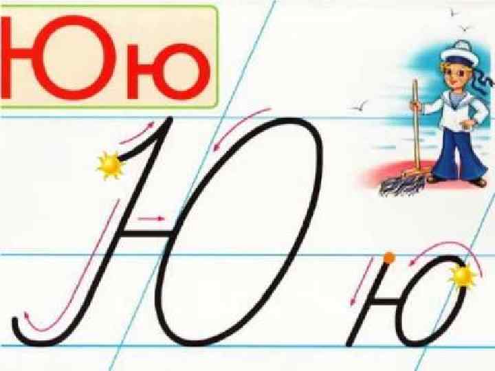Алгоритм написання рядкової букви ю 1. Починаємо писати коротку пряму лінію від верхньої робочої лінії вниз на себе до нижньої рядкової лінії 2. Від середини першого елемента праворуч ведемо коротку горизонтальну пряму лінію на відстань, що дорівнює половині висоти робочого рядка 3. Відступивши від кінця другого елемента на ширину овалу, пишемо третій елемент 4. Починаємо нижче верхньої рядкової лінії 5. Ведемо вгору до верхньої лінії робочого рядочка 6. Торкнувшись верхньої робочої лінії, заокруглюємо ліворуч 7. Ведемо вниз на себе, теж заокруглюючи 8. Біля нижньої рядкової лінії заокруглюємо праворуч 9. Торкнувшись нижньої рядкової лінії, ведемо вгору до початку овалу Алгоритм написання великої букви Ю 1. Починаємо писати вище середини відстані між верхньої рядковою та верхньою міжрядковою лініями 2. Ведемо коротку пряму похилу праворуч угору до верхньої міжрядкової лінії 3. Торкнувшись цієї лінії, не відриваючи руки, ведемо вниз на себе довгу пряму лінію до нижньої рядкової лінії. Заокруглюємо вліво 5. Закінчуємо писати близько середини робочого рядка 6. Від середини другого елемента трішки вище верхньої рядкової лінії зліва праворуч ведемо коротку горизонтальну лінію на відстань, що дорівнює половині робочого рядка 7. Відступивши від кінця другого елемента на ширину овалу, пишемо четвертий елемент 8. Починаємо трохи нижче верхньої міжрядкової лінії 9. Ведемо, заокруглюючи ліворуч угору 10. Торкаючись верхньої міжрядкової лінії, заокруглюємо ліворуч 11. Ведемо вниз на себе, теж заокруглюючи 12. Торкаючись нижньої рядкової лінії, заокруглюємо праворуч 13. Ведемо вгору до початку овалу