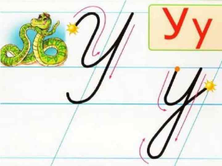 Алгоритм написання рядкової букви у 1. Пишемо від верхньої рядкової лінії коротку пряму вниз на себе 2. Біля нижньої рядкової лінії заокруглюємо правруч 3. Торкнувшись нижньої робочої лінії, ведемо вгору до верхньої рядкової лінії 4. Не відриваючи руки, ведемо по писаному довгу пряму вниз на себе до нижньої міжрядкової 5. Заокруглюємо праворуч 6. Торкаючись нижньої міжрядкової лінії, ведемо вгору до перетину з нижньою рядковою і прямою лініями 7. Закінчуємо писати бдизько серединиробочого рядка Алгоритм написання великої букви У 1. Починаємо писати нижче верхньої міжрядкової лінії 2. Ведемо, заокруглюючи праворуч, угору до верхньої міжрядкової лінії 3. На відстані, що дорівнює половині робочого рядка, заокруглюємо праворуч 4. Ведемо пряму вниз на себе до верхньої рядкової лінії 5. Заокруглюємо праворуч, торкаючись цієї лінії, і продовжуємо до верхньої міжрядкової лінії 6. Не відриваючи руки, ведемо по писаному до верхньої лінії робочого рядка 7. Ведемо далі вниз на себе довгу пряму до нижньої рядкової лінії 8. Торкнувшись нижньої рядкової лінії, заокруглюємо ліворуч 9. Закінчуємо писати близько середини робочого рядка