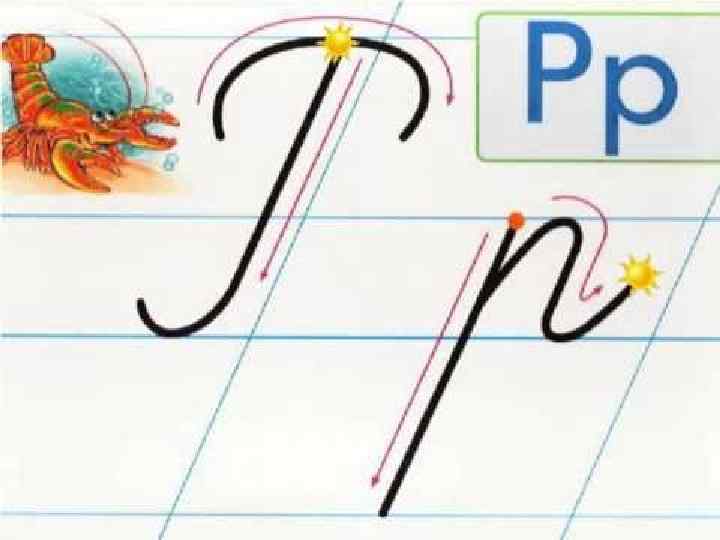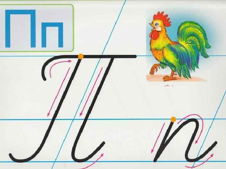 Алгоритм написання рядкової букви п ( «пе» ) 1. Ведемо від верхньої до нижньої рядкової лінії вниз на себе коротку пряму лінію 2. Повертаємося по писаному майже до верхньої робочої лінії 3. Заокруглюємо праворуч, торкаючись верхньої лінії робочого рядка 4. Ведемо вниз на себе коротку пряму лінію до нижньої рядкової лінії 5. Торкаючись нижньої лінії робочого рядка, заокруглюємо праворуч 6. Закінчуємо писати близько середини робочого рядка Алгоритм написання великої букви П ( «пe» ) 1. Починаємо писати від верхньої міжрядкової лінії 2. Ведемо від верхньої міжрядкової лінії пряму довгу лінію вниз на себе до нижньої рядкової лінії 3. Торкаючись нижньої робочої лінії, заокруглюємо ліворуч 4. Закінчуємо писати близько середини робочого рядка 5. Від початку першого елемента залишаємо відстань, яка дорівнює половині висоти від верхньої міжрядкової до верхньої рядкової лінії 6. Ведемо пряму довгу лінію вниз на себе до нижньої лінії робочого рядка 7. Заокруглюємо праворуч 8. Закінчуємо писати близько середини робочого рядка 9. Відступаємо від початку першого елемента вліво відстань, що дорівнює половині висоти від верхньої міжрядкової до верхньої рядкової лінії 10. Починаємо писати нижче верхньої міжрядкової лінії 11. Заокруглюємо праворуч угору до верхньої міжрядкової лінії 12. Ведемо далі по верхній міжрядковій лінії, торкаючись початку першого і другого елементів 13. Закінчуємо писати від початку другого елемента на відстані, що дорівнює ширині робочого рядка