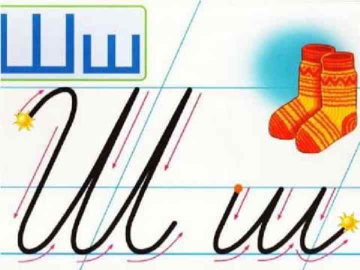 Алгоритм написання рядкової букви ш ( «ша» ) 1. Починаємо писати від верхньої рядкової лінії пряму коротку лінію вниз на себе 2. Біля нижньої рядкової заокруглюємо праворуч 3. Торкнувшись нижньої лінії робочого рядочка, ведемо вгору до верхньої рядкової лінії 4. Не відриваючи руки, ведемо по писаному на себе коротку пряму вниз Біля нижньої рядкової заокруглюємо праворуч 5. Торкнувшись нижньої лінії робочого рядочка, ведемо вгору до верхньої рядкової лінії 6. Не відриваючи руки, ведемо по писаному на себе коротку пряму вниз 7. Заокруглюємо біля нижньої рядкової праворуч вгору 8. Закінчуємо писати близько середини робочого рядка Алгоритм написання великої букви Ш ( «ша» ) 1. Починаємо писати нижче верхньої міжрядкової лінії 2. Ведемо, заокруглюючи, угору, до верхньої міжрядкової лінії 3. На відстані, що дорівнює половині робочого рядка, заокруглюємо праворуч 4. Ведемо довгу пряму лінію вниз на себе до нижньої рядкової лінії 5. Заокруглюємо праворуч 6. Продовжуємо до верхньої міжрядкової лінії 7. Не відриваючи руки, повертаємося по написаному на себе від верхньої міжрядкової до верхньої рядкової 8. Ведемо далі до нижньої рядкової 9. Торкаючись нижньої рядкової лінії, заокруглюємо праворуч 10. Ведемо вгору до верхньої міжрядкової лінії 11. Не відриваючи руки, ведемо по писаному довгу пряму лінію вниз на себе 12. Біля нижньої рядкової заокруглюємо праворуч, торкнувшись цієї лінії 13. Закінчуємо писати близько середини робочого рядка
