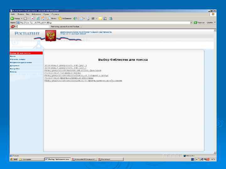 ШАГ 4 При правильном вводе имени пользователя и пароля после нажатия кнопки "Войти" пользователю становится доступной следующая страница, позволяющая осуществить выбор базы данных (БД). Примечание: бесплатным является доступ только к базам: «Рефераты российских патентных документов за 1994 -2007 (рус. )» , «Полные тексты российских патентных документов из последнего бюллетеня (рус. )» и «Формулы полезных моделей из последнего бюллетеня» .