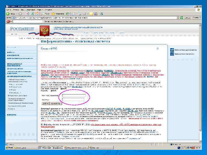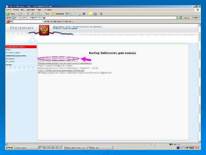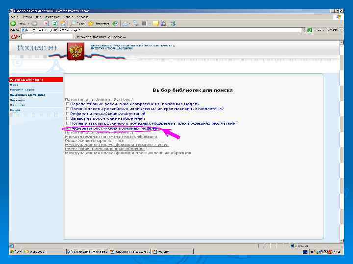 ШАГ 5 При правильном вводе имени пользователя и пароля после нажатия кнопки "Войти" пользователю становится доступной следующая страница, позволяющая осуществить выбор базы данных (БД). Примечание: бесплатным является доступ только к базам: «Рефераты российских патентных документов за 1994 -2007 (рус. )» , «Полные тексты российских патентных документов из последнего бюллетеня (рус. )» и «Формулы полезных моделей из последнего бюллетеня» .