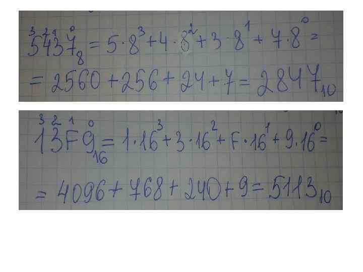 Алгоритм перевода чисел из любой системы счисления в десятичную 1. Представить число в развернутой форме. При этом основание системы счисления должно быть представлено в десятичной системе счисления 2. Найти сумму ряда (выражения). Полученное число является значением числа в десятичной системе счисления.