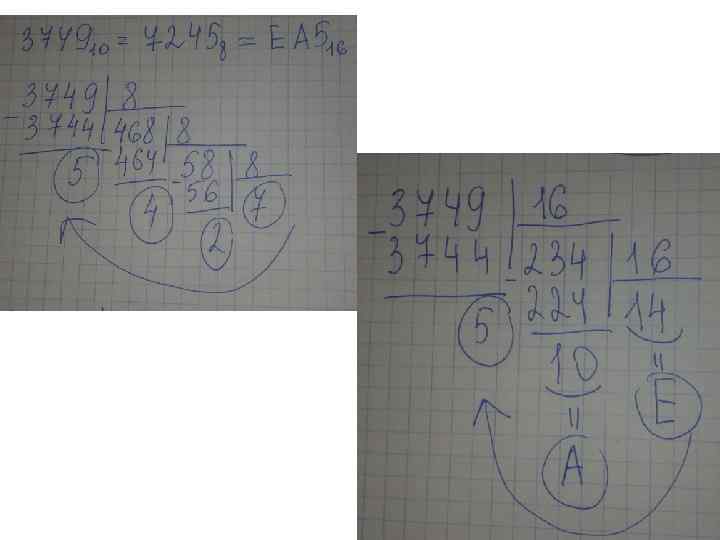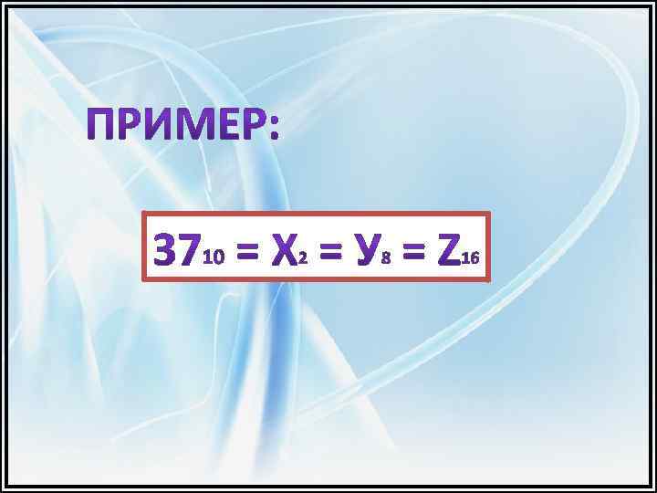 ой из 10 -тичн ел ревода чис е Алгоритм п ую - 8 - 16 -ричн с. с. в 2 1. Последовательно выполнять деление исходного целого числа и получаемых целых остатков на основание системы (2, 8, 16) до тех пор, пока не получится частное меньше делителя; 2. Получить искомое число, для чего записать полученные остатки в обратной последовательности. :