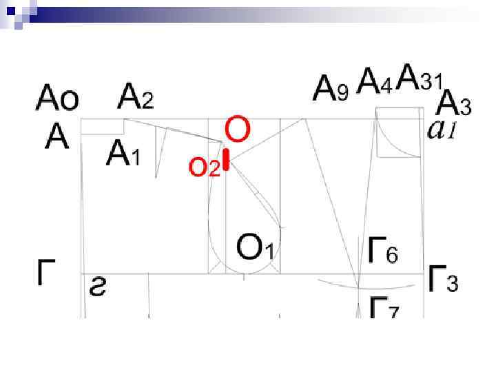 Точка Р 3 – задняя контрольная надсечка. Соответствует положению точки П 3 на чертеже проймы спинки: О 4 О 2 О 3 n Вверх от точки Рл откладывают отрезок Рл. Р 3 = Г 1 П 3 = 8, 5 см Р'3 Р 3 1 1' О 1 Рп Рл Р 3 n Влево от точки Р 3 откладывают 1, 0 см и получают точку Р 3: Р 3 = 1, 0 см