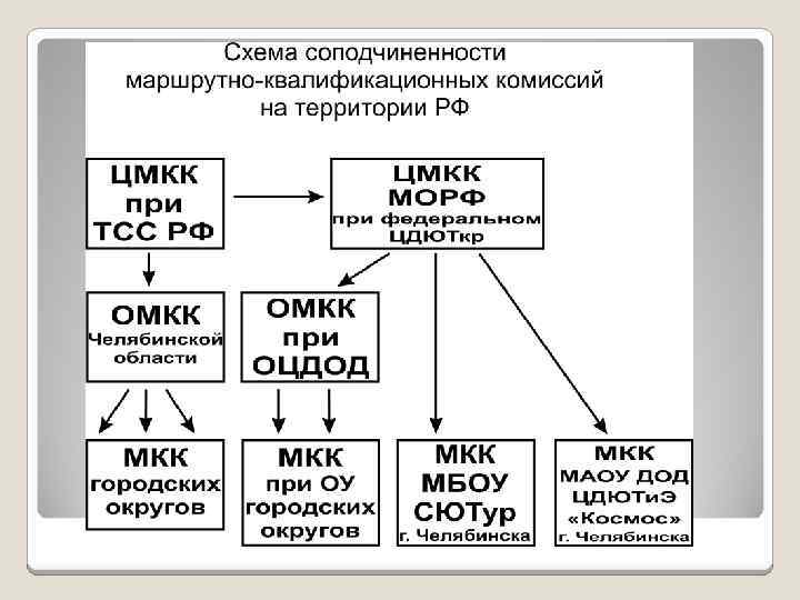 Содержание работы МКК МКК контролирует прохождение группами контрольных пунктов; проводит контрольные проверки групп на местности; рассматривает отчетные документы о прохождении маршрутов; дает заключение на присвоение судейских, инструкторских, спортивных званий и разрядов в данном виде туристско-спортивных соревнований; рассматривает случаи нарушения Правил и других нормативных документов спортивного туризма; проводит совещания, сборы, походы, семинары с целью повышения квалификации членов МКК; обеспечивает судейство соревнований спортивных туристских походов, осуществляет анализ аварийных ситуаций и несчастных случаев в и разрабатывает рекомендации по обеспечению безопасности на маршрутах.